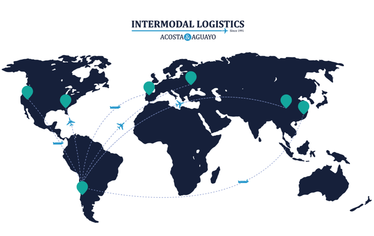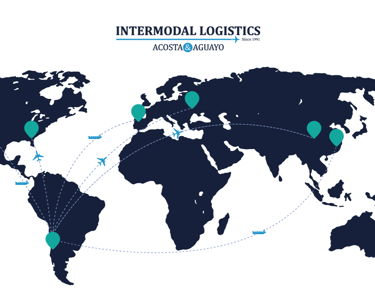 Finanzas: La gráfica fue diseñada para destacar la presencia global de Acosta & Aguayo, utilizando un mapa mundial que muestra las principales rutas logísticas intermodales de la empresa. Este diseño subraya la precisión y el alcance global de sus operaciones, fundamentales en la gestión financiera y logística.